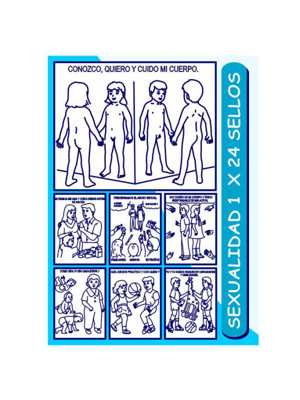 Sellos Educativos de Sexualidad REF 1, empacados en lona con cremallera y tapa transparente que contiene 24 sellos de tamaño 14 x 11 cm, el tamaño de la almohadilla es de 18 x 14 cm y tinta de 30 cc.