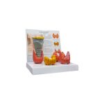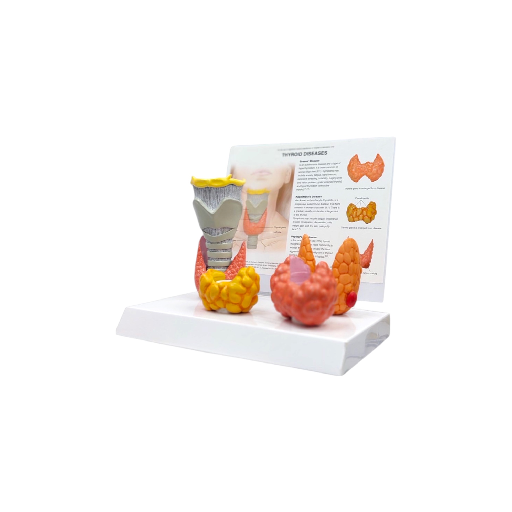 Este modelo anatómico representa la glándula tiroides en diferentes estados: normal, tiroiditis de Hashimoto, enfermedad de Graves y carcinoma papilar. Cada pieza muestra detalles anatómicos precisos, permitiendo una comprensión clara de las variaciones patológicas.