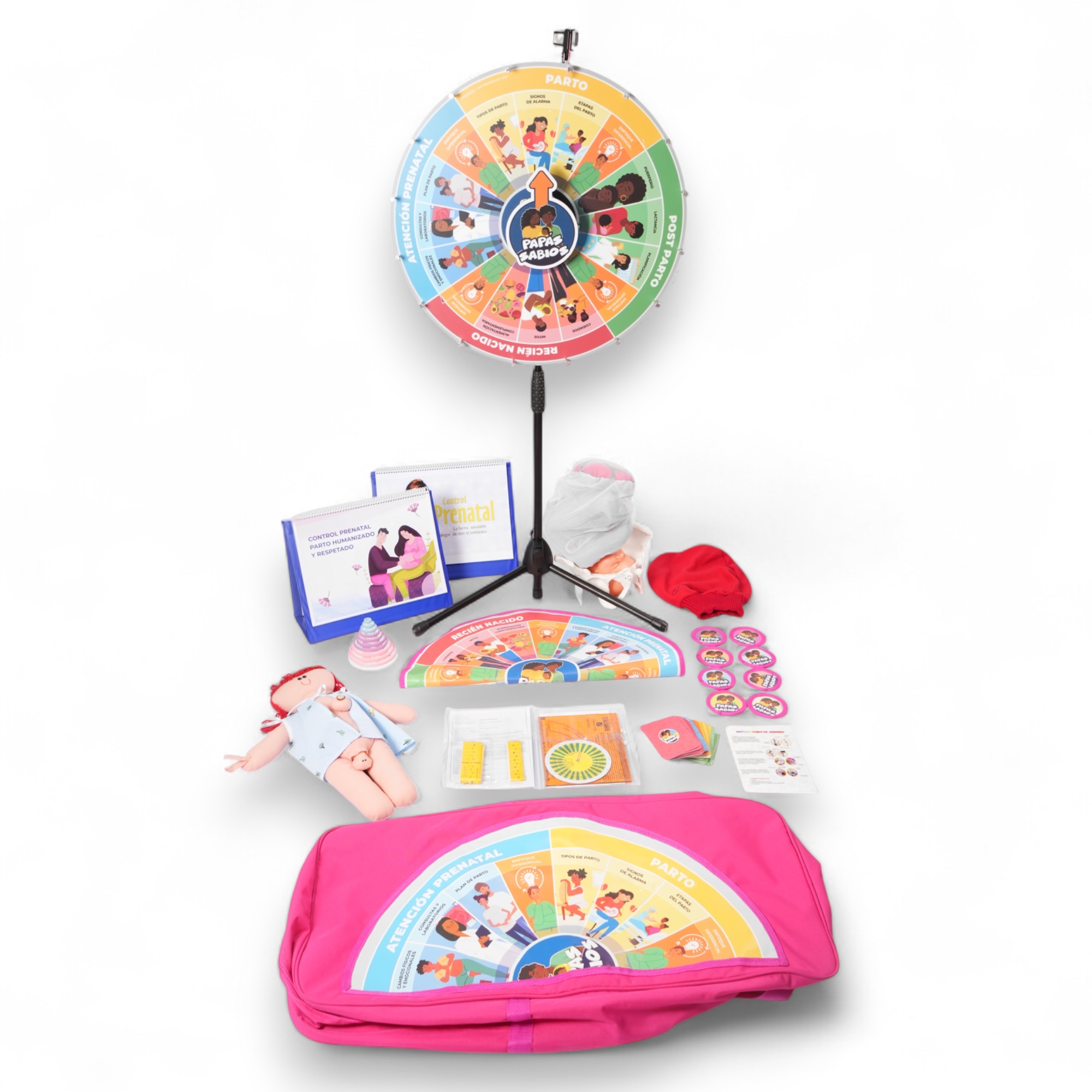Ruleta “Padres Sabios”: incluye 2 semicírculos, cartas temáticas (recién nacido, control prenatal, parto, posparto), base metálica, tablero y 8 fichas de tela.
