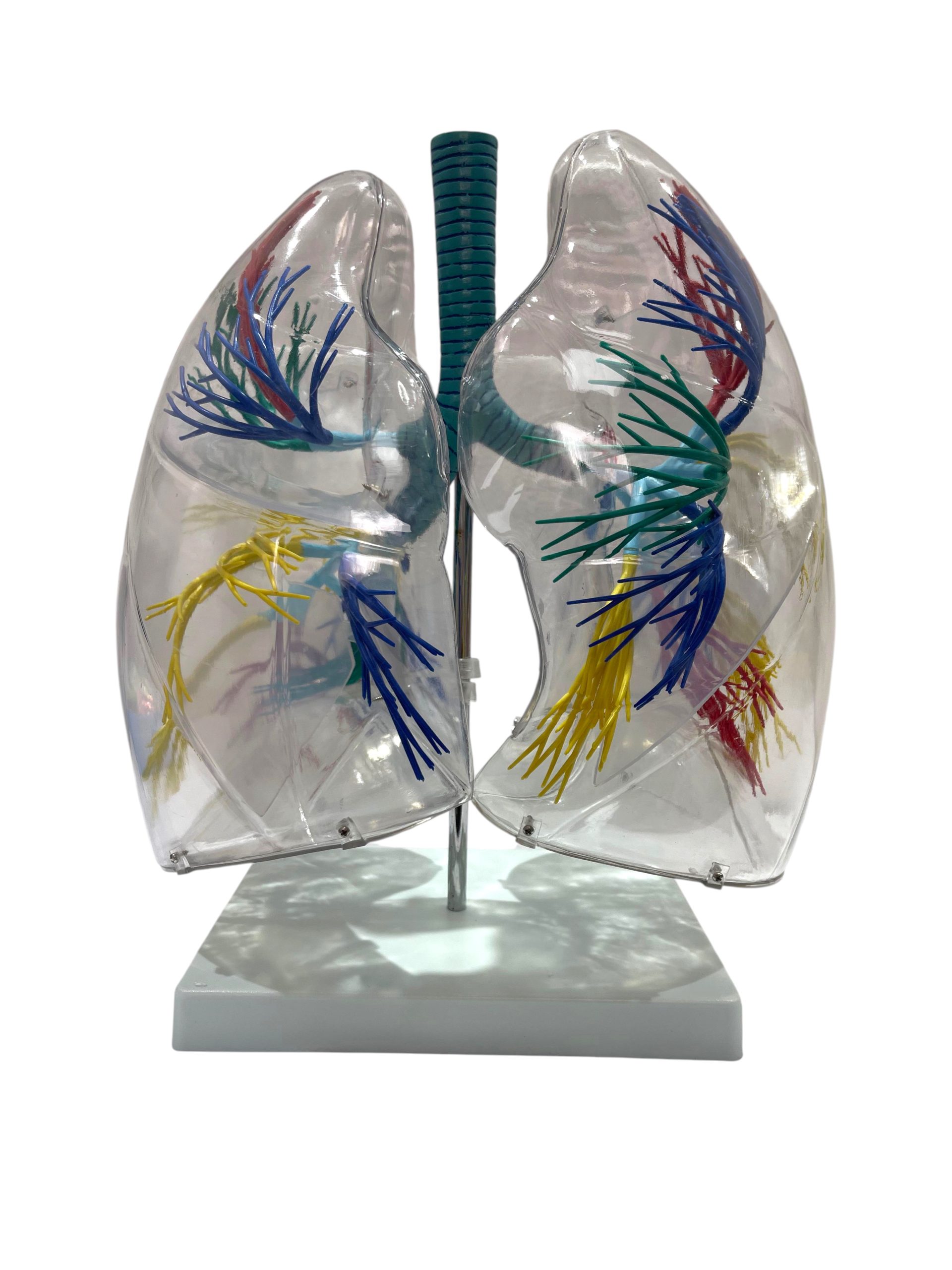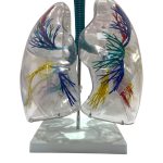 Visualización interna realista: La transparencia del material permite observar directamente el recorrido del árbol bronquial dentro de cada pulmón, facilitando la explicación de la ventilación pulmonar y la anatomía respiratoria.